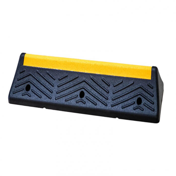 Wheel Park Stop for heavy Trucks, black rubber with yellow retroreflective warn foil, 5 x drill holes, indoor and outdoor use.
